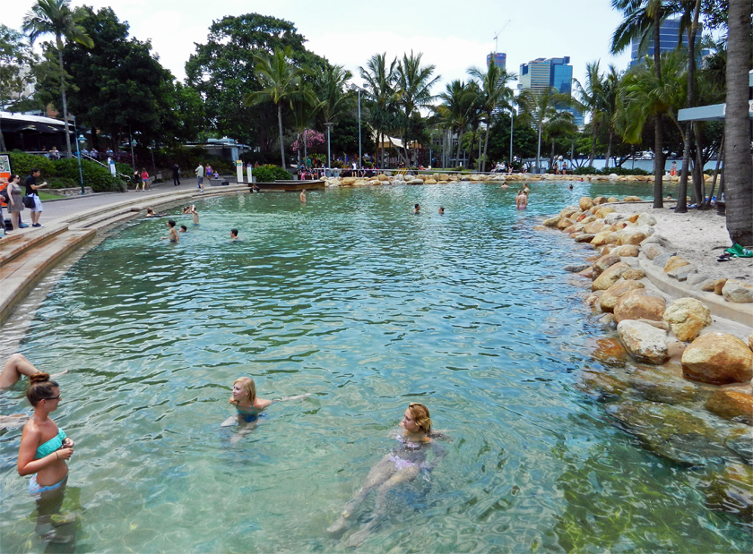 Day two was hot and sunny.  Clear skies prevailed, making for a hot, half-hour walk through Queen Street Mall, over Victoria Bridge, and into South Bank Parklands.  South Bank Parklands is a massive area along the edge of the Brisbane River, with a wide variety of restaurants and cafes.  Other attractions include a giant ferris wheel known as the Wheel of Brisbane and a man-made beach known as Streets Beach. The view from the edge of the Brisbane River is spectacular. It is even more impressive at night as the bright city lights reflect against the surface of the river.  During our jaunt along the South Bank, we spent much of our time taking pictures of the city and relaxing at the edge of Streets Beach.  Heading back to the hotel along Queen Street Mall, we stopped to enjoy the Hawaiian music and hula entertainment Hawaiian Air had setup near the Wintergarden retail outlets to promote their newest route from Hawaii to Brisbane.
